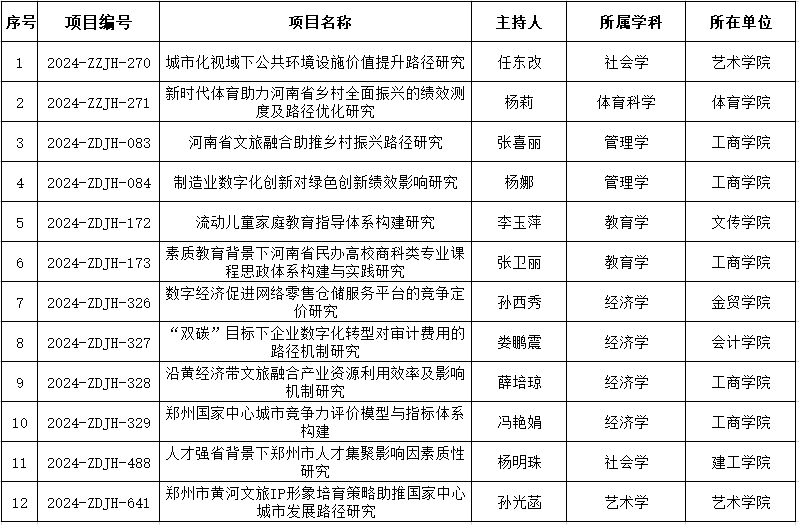 根据《河南省教育厅办公室关于2024年度河南省高校人文社会科学研究一般项目申报工作的通知》(教办社语〔2023〕108号),beat36512项2024年度河南省高校人文社会科学研究一般项目获批立项。请各课题组认真组织实施,在规定时间内保质保量完成课题研究。