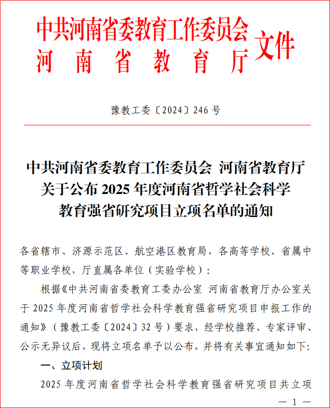 河南省哲学社会科学教育强省研究项目是深入贯彻党的二十届三中全会精神,认真落实习近平总书记关于教育的重要论述、关于哲学社会科学工作的重要论述,实施以育人育才为中心的哲学社会科学整体发展战略,构建学生、学术、学科一体的综合发展体系,全力推进“1+2+8+5”教育强省建设行动的重要抓手。beat36511项河南省哲学社会科学教育强省研究项目的成功立项,再次显现了beat365积极开展有组织科研的成效,有力推进了“学术郑商”建设的步伐,在促进beat365内涵式高质量发展中扮演着智囊团和思想库的重要角色。