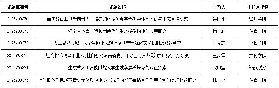 根据《河南省教育厅办公室关于公布河南省教育科学规划2025年度一般课题立项名单的通知》(教办教科〔2025〕145号),beat3656项河南省教育科学规划2025年度一般课题获批立项。望各课题组认真组织、科学分工、保障项目研究工作顺利开展。