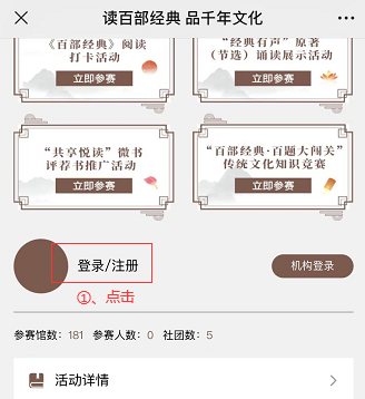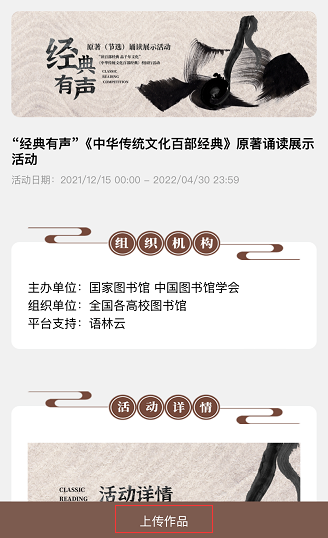 第二步:注册完成后,进入活动页面选择“经典有声”原著(节选)诵读展示活动,点击上传作品。