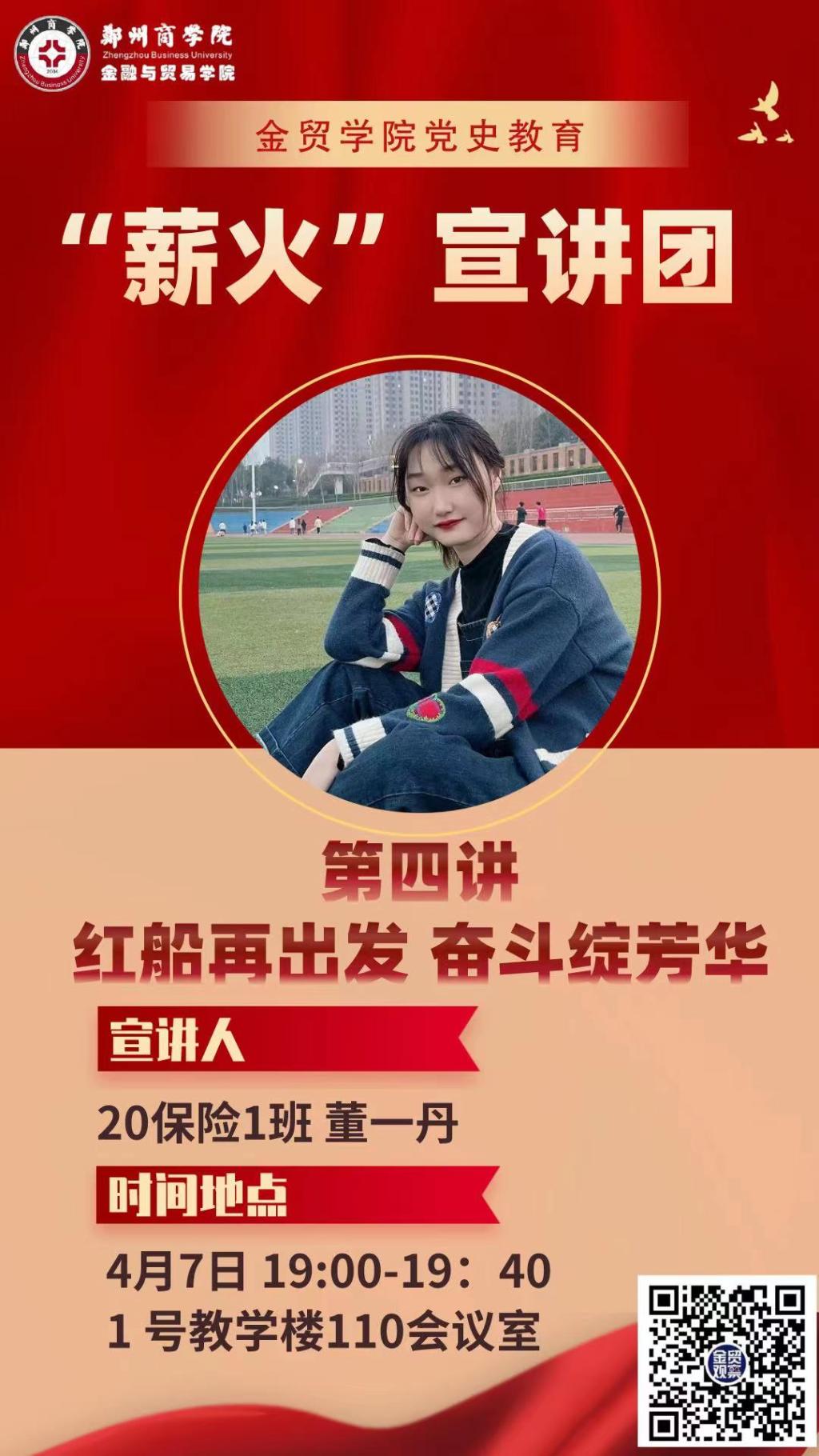 百年风雨奋进,红色薪火相传。为深入学习贯彻习近平总书记在党史学习教育动员大会上的重要讲话精神,引导全院青年学生重温红色经典故事、读党史知党史,做到学史明理、学史增信、学史崇德、学史力行,4月7日,金贸学院开展“薪火”宣讲团第四讲——红船再出发 奋斗绽芳华。