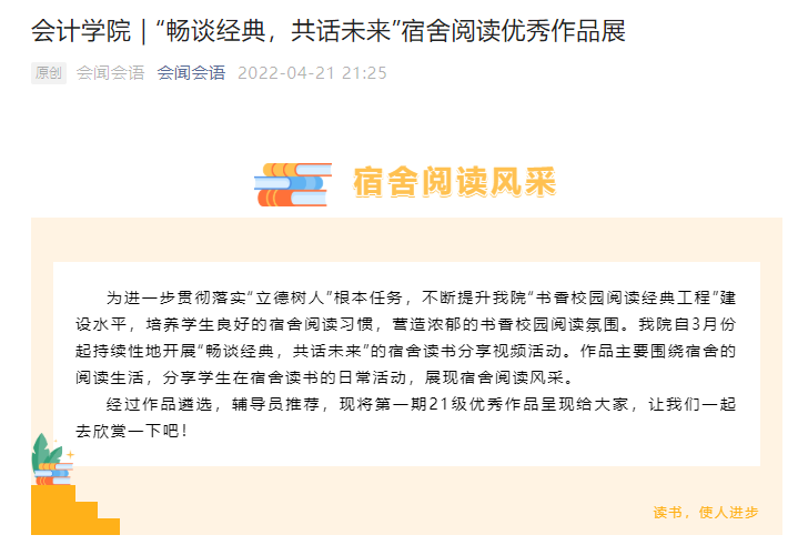 为进一步贯彻落实“立德树人”根本任务,不断提升学院“书香校园阅读经典工程”建设水平,培养学生良好的宿舍阅读习惯,营造浓郁的书香校园阅读氛围,会计学院自3月份起持续性开展“畅谈经典,共话未来”宿舍读书分享视频活动。经过作品筛选,本周会计学院微信公众号第一期优秀作品已推送,展现了学子宿舍阅读风采。