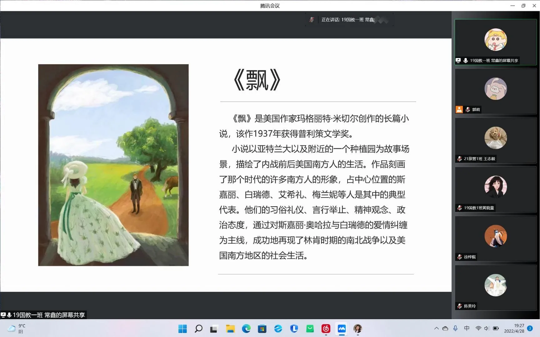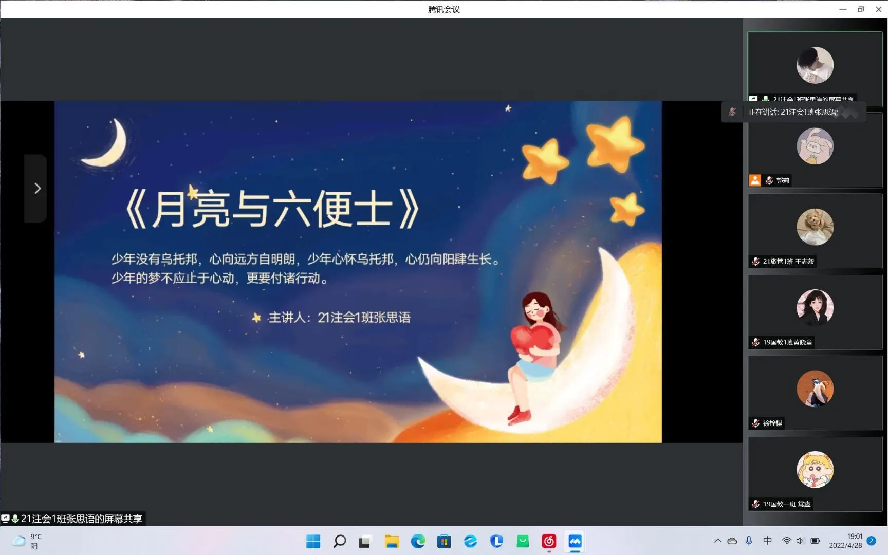 为推动“书香校园阅读经典工程”建设,引导学生阅读经典,4月28日,由图书馆主办、郑商书友会协办的“我的读书活动”校园巡讲活动在线上举行。本次活动分享了3本书籍,分别为由文传学院19国教1班常鑫分享《飘》、黄晓童分享《少年派的奇幻漂流》,以及会计学院21注会1班张思语分享《月亮与六便士》。
