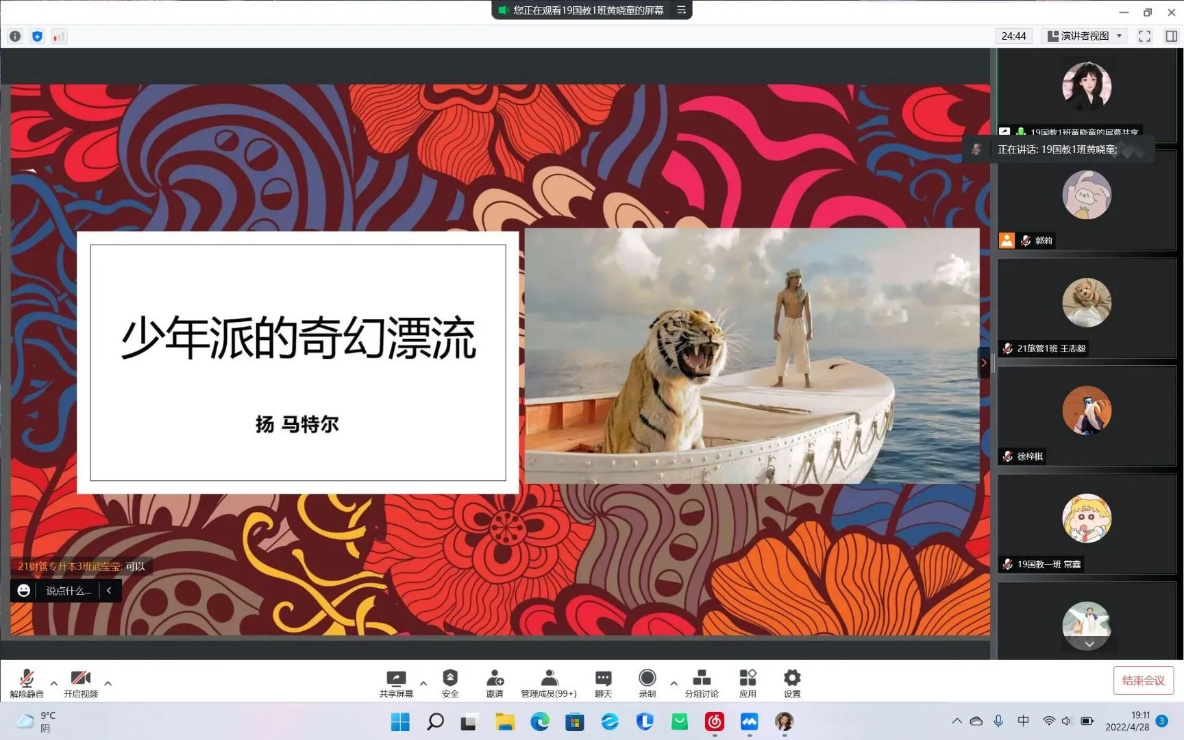 “没有任何人会成为你以为的、今生今世的避风港,只有你自己,才是自己最后的避风所。”常鑫同学通过简洁的语言,将《飘》的主要情节娓娓道来,并以女主人公三次婚姻的选择启发同学们树立正确的人生观、价值观与爱情观,引发与会同学思考,激发阅读兴趣。而黄晓童同学通过集奇幻与恐怖一体的《少年派的奇幻漂流》,向同学们提出问题:当生存的欲望冲破伦理的枷锁,靠着绝境里求生后,人将如何找到自己的位置?黄晓童同学以其对《少年派的奇幻漂流》的独特见解为同学们打开新的大门。“满地都是六便士,他却抬头看见了月亮。”每个人都有自己诗与远方,有些人被生活的苟且蒙住了双眼,而有些人以坚定而又激情饱满的心态奔向了它。张思语同学以积极向上的语言,激情洋溢的演讲鼓舞同学们与理想为伍,与平庸相斥。少年没有乌托邦,心向远方自明朗。