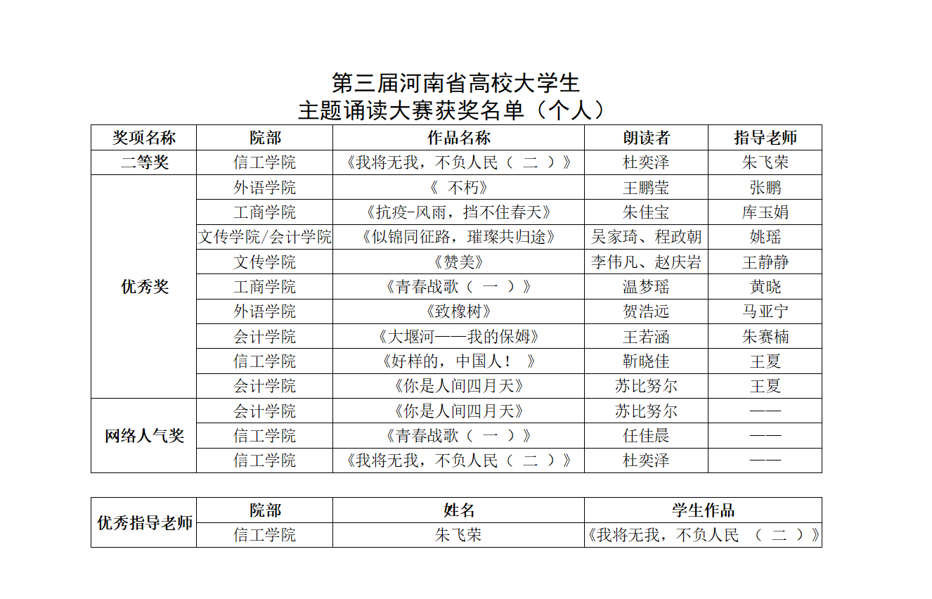 声音传承文化,诵读打动人心。近日,第三届河南高校大学生“踔厉奋发正青春·笃行不怠向未来”主题诵读大赛公布表彰决定。图书馆精心组织校内初赛并遴选优秀作品上报大赛组委会。经组委会专家评审,beat365因组织得力荣获“优秀组织奖”;beat365学生荣获二等奖1名、优秀奖9名、网络人气奖3名;信工学院朱飞荣老师荣获“优秀指导老师”。