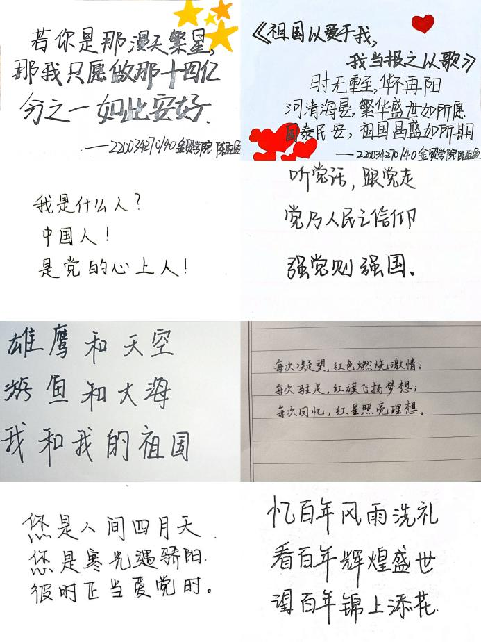 寒假期间,金贸学院面向全体学生开展“诗韵赤诚传心意,三行句里寄真情”征文活动。辞虽浅,情却深,短短三行情诗展现了莘莘学子的爱党爱国情怀和对党的坚定信仰。此次征文活动不仅传递出青年学生的拳拳爱国之心以及对党的无限感激之情,同时营造出了创先争优、和谐进取、热烈向上的良好氛围。