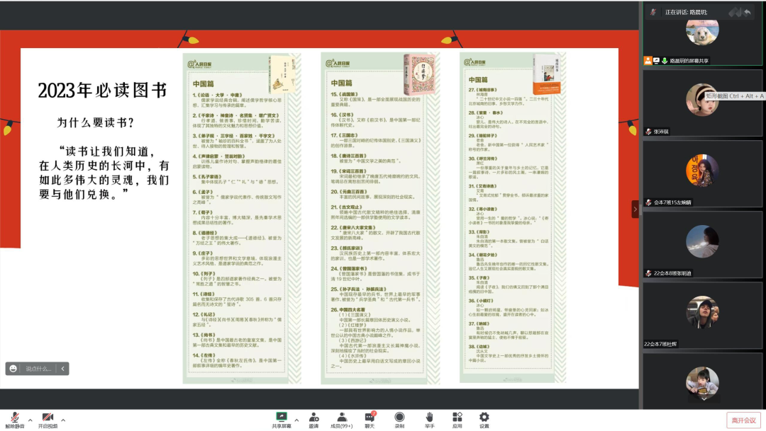 为积极响应学校书香校园阅读经典工程,会计学院结合2023年《人民日报》推荐的100部国内外经典书籍,近日组织各班级召开了“2023必读书目推荐主题班会”,本次主题班会旨在引导学生边读书边做读书笔记,产生新思考,发现新问题,探索新方案。