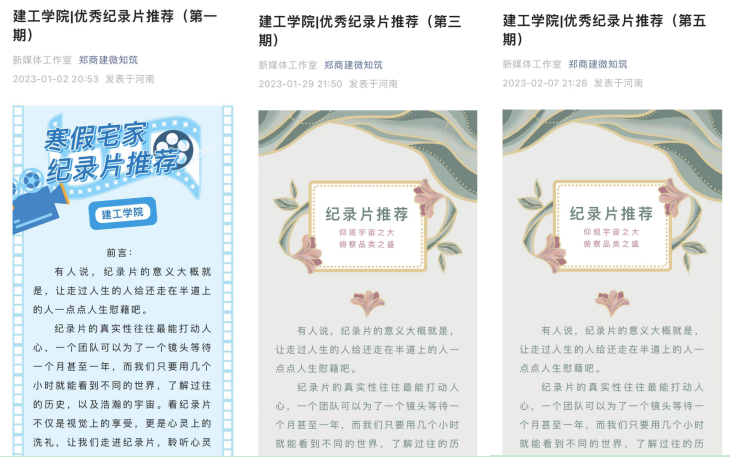 为推动书香校园阅读经典工程,促进学生阅读习惯的养成,寒假期间,建工学院鼓励学生开展丰富的假期阅读活动,并在学院微信公众平台持续推出优秀纪录片推荐系列,带领学生从不同的视角了解不同的世界、历史背景、文化特色等,在享受阅读的同时,感受真挚的感情,在视听中共品飘逸书香。
