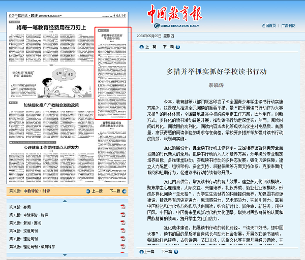 5月25日第02版发表文章《多措并举抓实抓好学校读书行动》