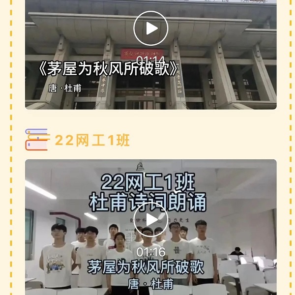 为进一步促进信工学院学生多读书、读好书、会读书,传承中华民族优秀传统文化,营造浓厚的书香校园文化氛围,本周,信工学院开展“杜诗共吟诵,经典咏流传”诗歌朗诵活动。活动中,各班级分别朗诵了《望岳》《春望》《登高》《茅屋为秋风所破歌》等经典诗篇。