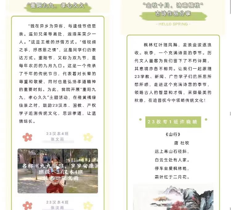 10月20日,文传学院举办“重阳九九,孝心久久”活动,邀请同学们以录视频的形式,传达对家中长辈们的关心,并邀同学们分享与秋季有关的诗词,领略古人的智慧和才情,在追昔抚今中领略传统文化。