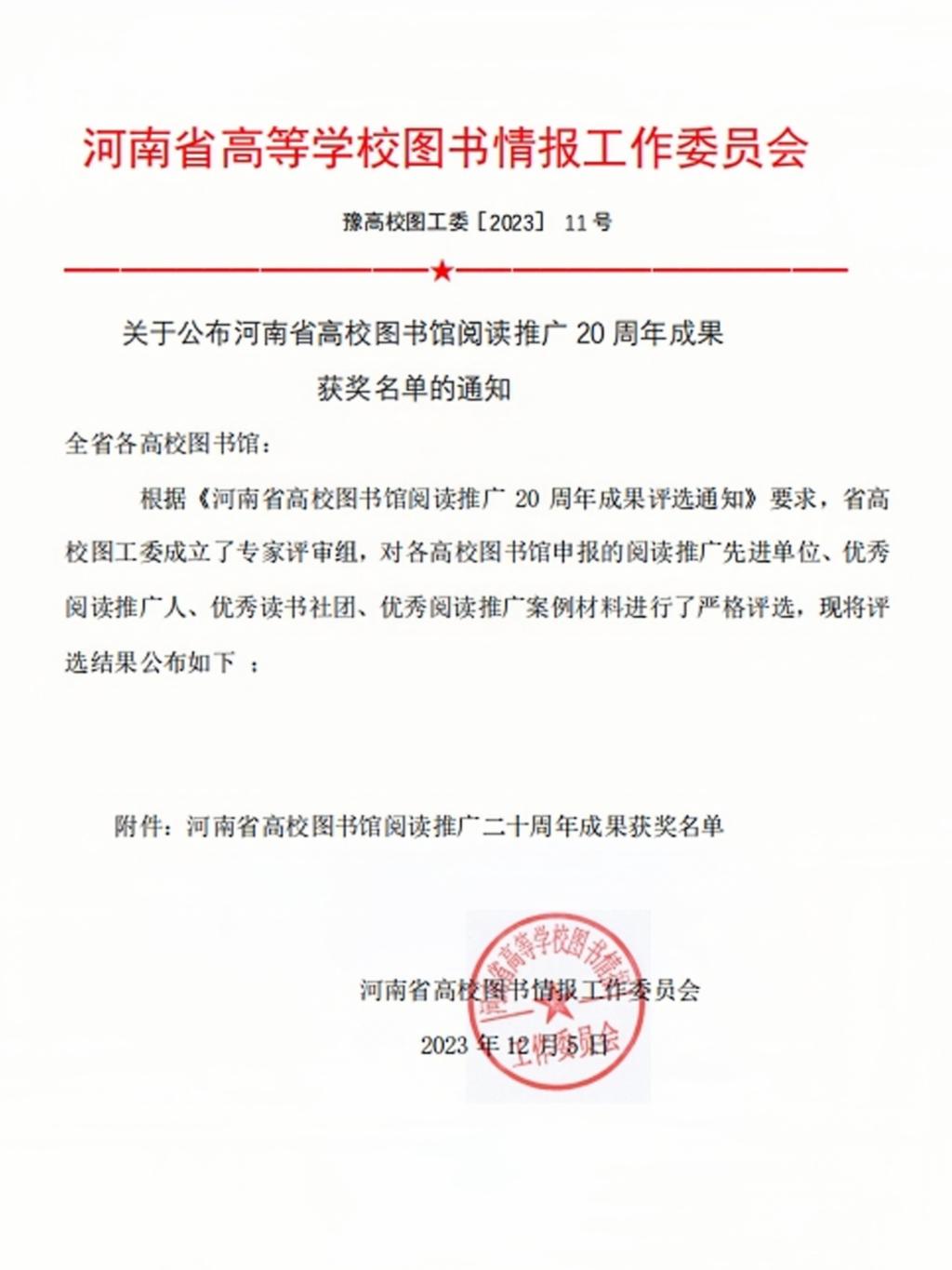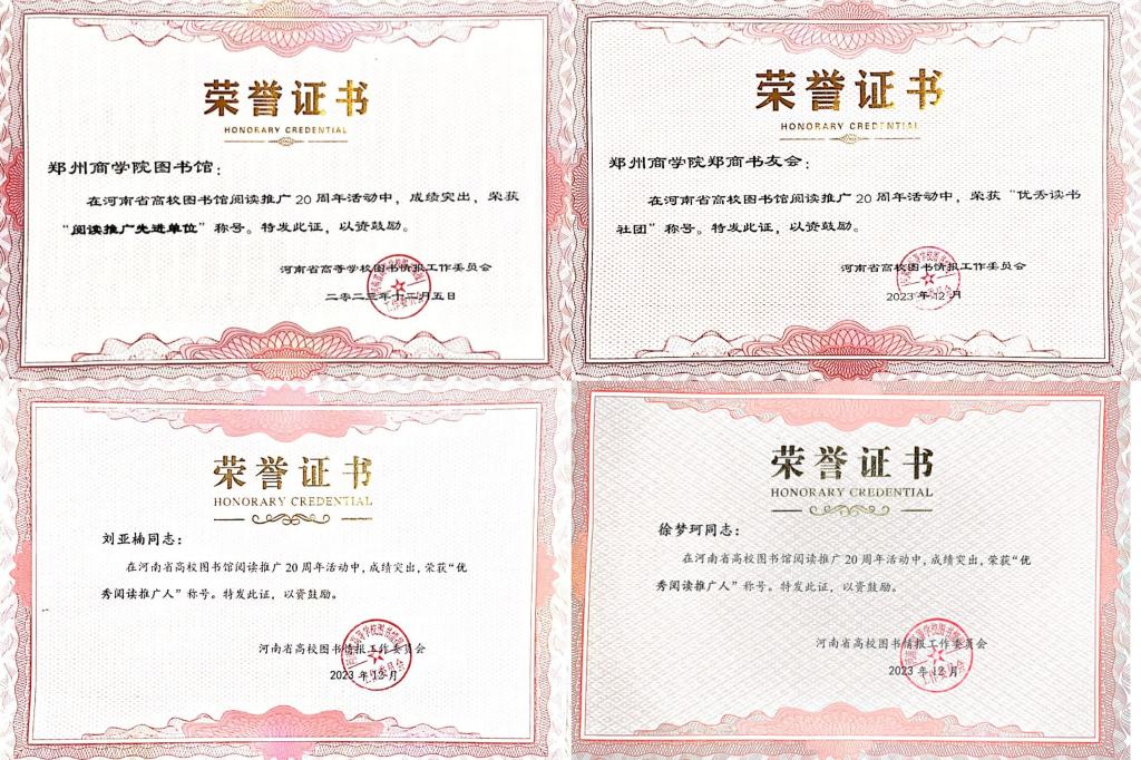 12月15日,由河南省高校图书情报工作委员会主办的河南省高校图书馆阅读推广20周年总结表彰大会在郑州大学图书馆成功举办。beat365图书馆荣获“河南省高校阅读推广先进单位”,书友会荣获“河南省高校图书馆阅读推广优秀读书社团”,刘亚楠、徐梦珂老师荣获“优秀阅读推广人”等称号。