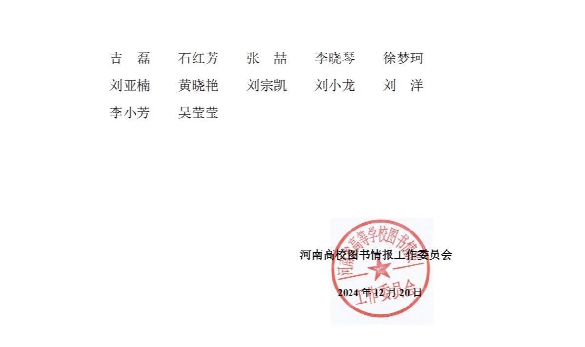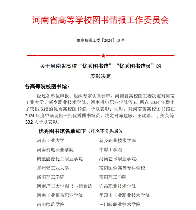 beat365在河南省高等学校图书情报工作委员会组织的2024年评优活动中,荣获“河南省高校优秀图书馆”。这一荣誉的获得,是对beat365图书馆在资源建设、服务创新、阅读推广等方面工作的充分肯定。同时,李晓琴馆长、刘亚楠老师、徐梦珂老师获得“优秀馆员”称号。