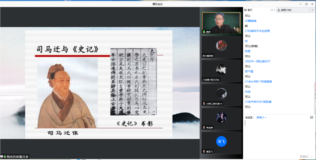 12月2日晚,由图书馆主办、郑商书友会协办的“郑商百家谈”第六讲,在腾讯会议成功举办。本次讲座采用线上直播的方式,由武汉大学古代文学博士梅伟老师主讲,向同学们解读史书经典《史记》中纵横家形象。