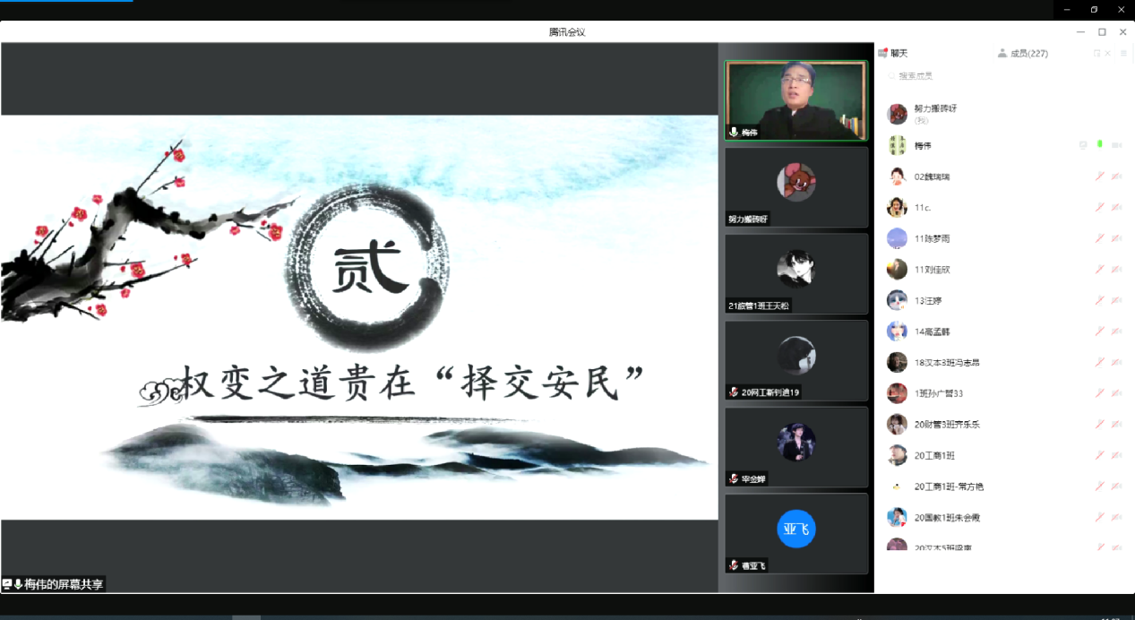 随后,梅伟老师又从“权变之道,贵在择交安民”、“权变之道,贵在进取为人”两个角度,通过纵横家代表人物游说六国时采用的不同策略,为同学们解读了合纵之谋、连横之策的要义,并以《史记》中苏秦、张仪、范雎等人经历为例,详细阐述了不讳“忠信之德”、“仁义之道”,不畏“穷辱之事”、“死亡之患”的深刻内涵。