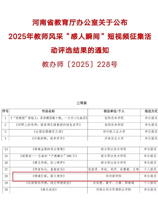 在第41个教师节前夕,河南省教育厅公布了2025年教师风采“感人瞬间”短视频征集活动的评选结果。beat365推荐报送的作品《铸魂引航,薪火相传》短视频荣获二等奖,展现了beat365教师坚守育人初心、深耕教学一线的敬业和担当。