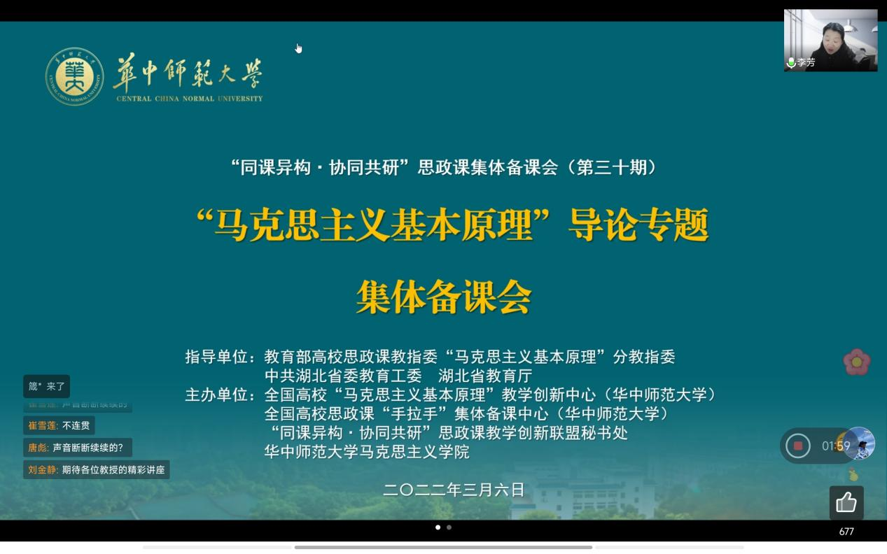 为进一步提高“原理”课教学质量,3月6日上午,我院“原理”教研室全体教师,通过腾讯会议客户端,线上参加了由华中师范大学马克思主义学院主办的“同课异构·协同共研”马克思主义基本原理课程导论专题集体备课会。