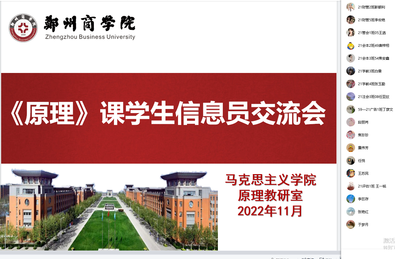 为进一步落实“以学生为中心”的教育教学理念,全面了解学生对《原理》课程教学的相关意见和建议,提高《原理》课程教学的针对性和实效性,增强学生的获得感,11月4日晚8点,《原理》教研室以线上腾讯会议的方式召开了本学期学生信息员交流会。会议由李巨存主任主持,《原理》教研室全体专职教师和学生代表参加。