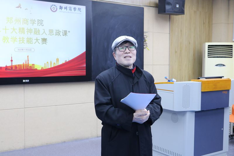 为推动党的二十大精神“进教材、进课堂、进头脑”,有效落实立德树人根本任务,推动思政课改革创新,不断增强思政课的思想性、理论性和亲和力、针对性,提升思政课教师队伍的整体水平,建设一支政治强、情怀深、思维新、视野广、自律严、人格正的高校思想政治理论课教师队伍,11月16日下午14:00,由校党委主办、我院承办的“党的二十大精神融入思政课”教学技能大赛在外语楼104录播室进行。特邀请校党委委员、宣传部程文质部长、教师发展中心石璐主任、校质评中心督导组姚旭东教授、通识教育中心邢克鑫教授、我院王苏民教授作为本次教学技能大赛的评委。我院张党诺院长和全体思政课教师现场观摩。