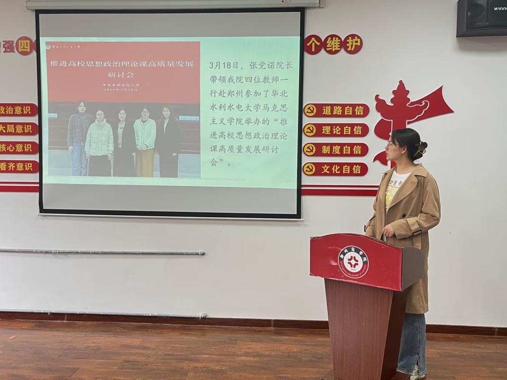 我院教师焦珍珍分享了在我院张党诺院长带领下参加“推进高校思想政治理论课高质量发展研讨会暨‘四课联动,思域融合’教学改革全国性研讨会”的相关内容。本次研讨会围绕学习宣传贯彻党的二十大精神,深入贯彻落实习近平总书记关于思政课建设的重要论述,推动高校思政课教学模式创新这一主题进行了深入讨论。焦珍珍老师表示将以此次研讨会为契机,全面深入贯彻落实党的二十大精神和习近平总书记在学校思想政治理论课教师座谈会上重要讲话精神,不断深化实践教学模式改革创新,把思政课讲深讲透讲活讲准。