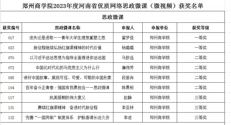 近日,河南省社会科学界联合会、共青团河南省委员会、河南省高等学校思想政治理论课教学指导委员会联合发布了2023年度河南省优质网络思政微课(微视频)获奖名单,我院教师共获思政微课奖项7项,其中一等奖2项、二等奖3项、三等奖3项。