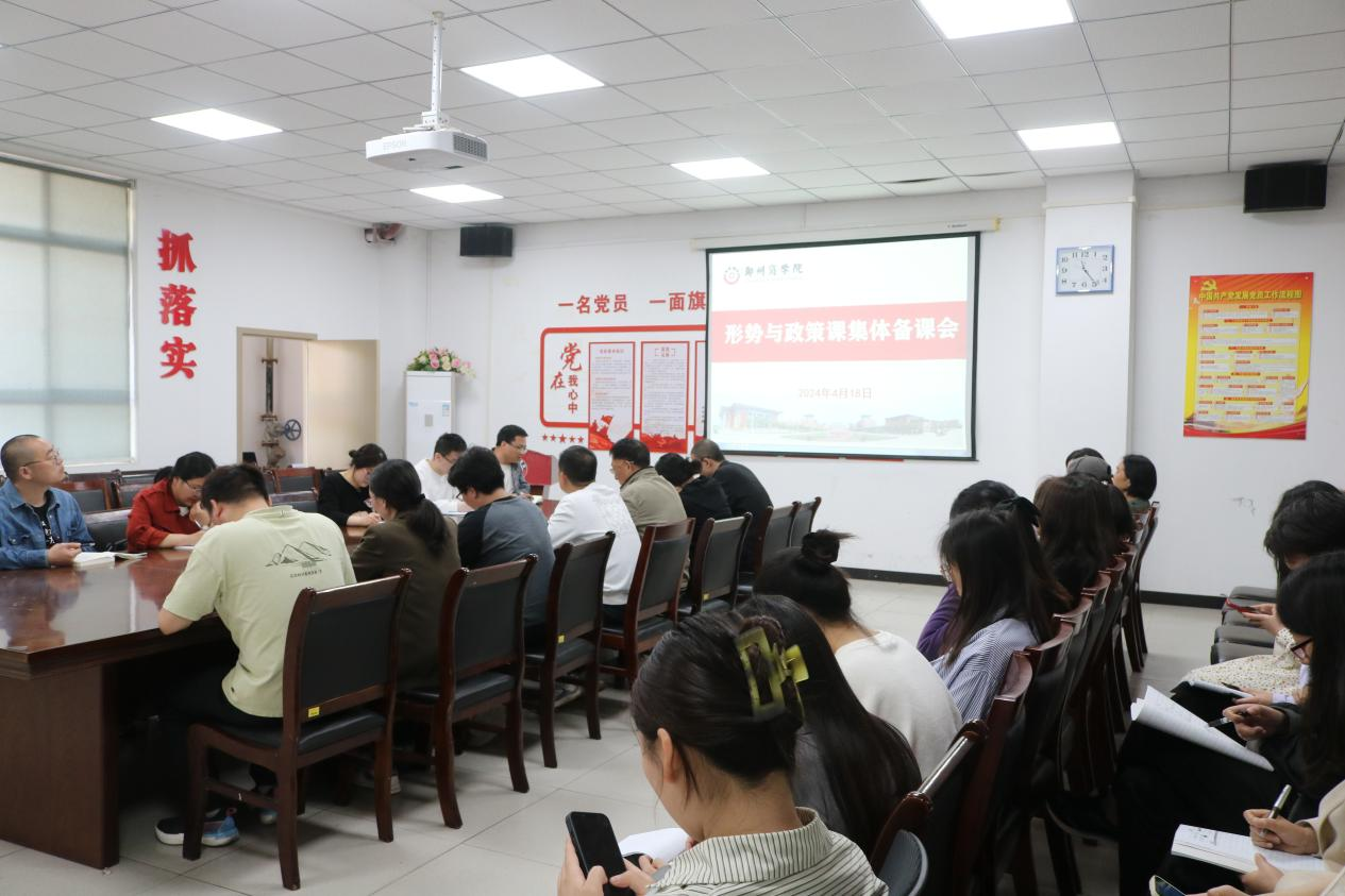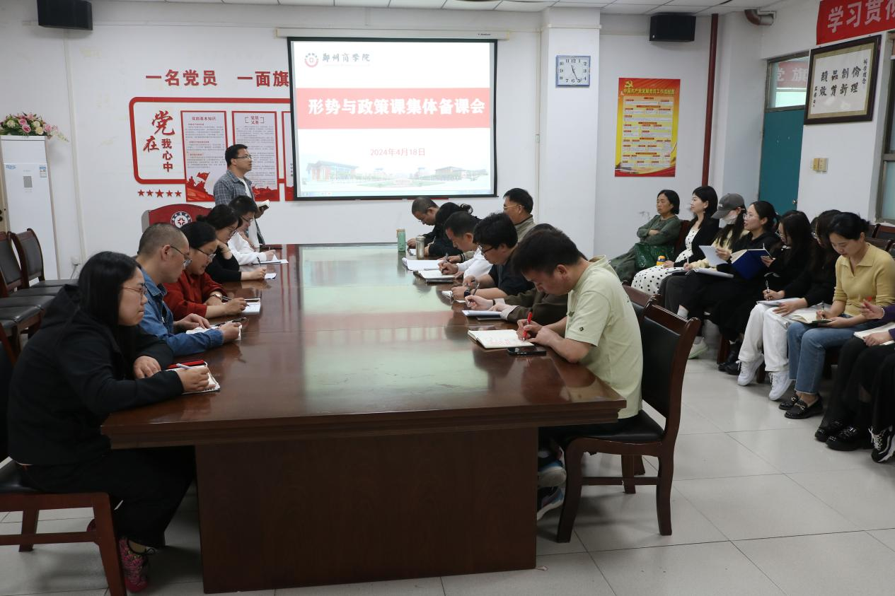 为进一步增强2023级学生“形势与政策”课程线上线下混合式教学成效,规范线下课堂教学,不断提升学生课程获得感,4月18日上午,我院在会议室召开了“形势与政策”课程集体备课会。本次会议由“形势与政策”教研室主任王俊明老师主持,全体无课教师准时参加。