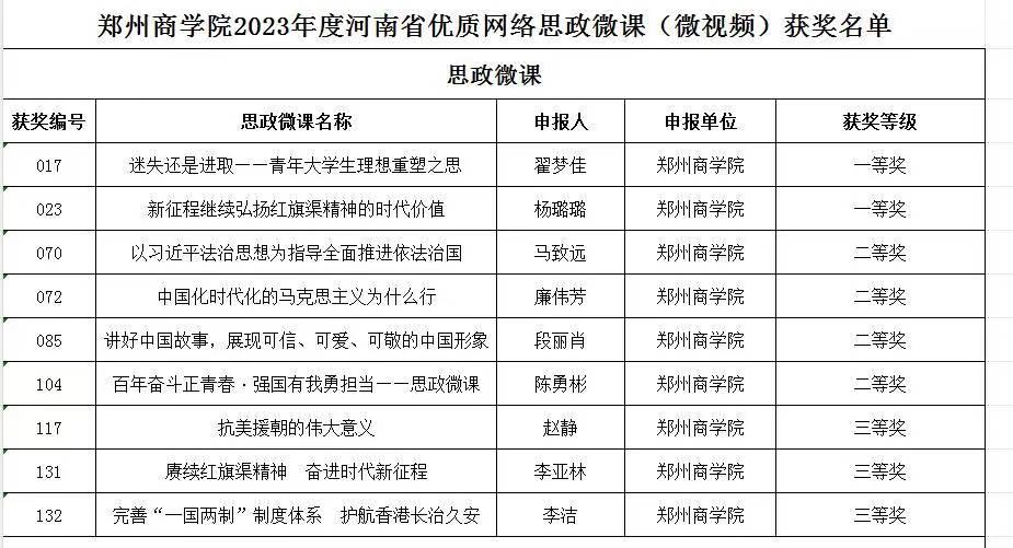 实施思政课堂教学质量专项提升行动,将“三全”监控工作落到实处。我院召开教学质量监控专题会议,进一步完善和细化教学质量监控工作体系,教学质量监控小组根据工作要求,明确责任分工,深入课堂问诊把脉,开学第一周重点督查新聘教师课堂,第一个月实现全体教师听课全覆盖,选树教学亮点,认真查摆问题,建立“问题清单”,针对存在的问题及时反馈、跟踪整改,实现对教学质量监控的常态化、全覆盖;阶段化开展集体听课评课提质活动,保障课堂教学质量稳步提升。基于教学岗位的磨炼,我院翟梦佳等8位教师在2023年度河南省优质网络思政微课(微视频)比赛中斩获多项奖项,充分展示出马院思政课教师的创新风采和实践能力。
