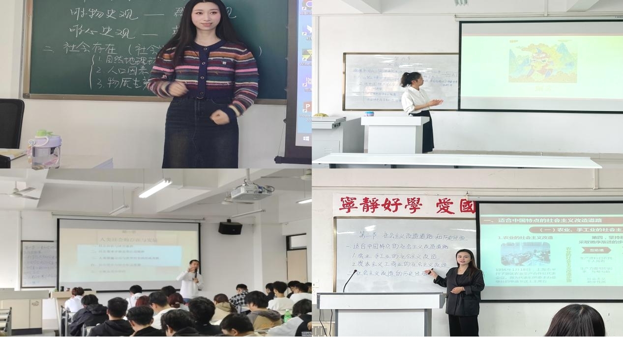 强化师资队伍培养培训,在精进教学技能上下功夫。一是多措并举助力教育“帮扶”新聘教师,助力青年教师快速成长成才。开课前新聘教师全员过课,确保站好讲台;开学第一周实现对2位新聘青年教师听课全覆盖,开展新聘教师“微课”活动,夯实新教师驾驭课堂教学的基本功。经听课,新聘教师教学基本功扎实,能够很好地组织课堂,整体教学较好。二是系统统筹规划各级别思政课教学比赛,围绕即将举办的全省思政课教师“大比武”、河南省工会思政课教师比赛等系列比赛,学院全程护航,精准把脉指导,通过“名师工作坊”邀请省内外教学名师面对面交流、手把手指导;以教研室为单位进行“三五集体备课”,开展“人人练、章章练、节节练”活动,汇聚每位教师的思政力量,挖掘紧跟时代的思政元素,精心打磨,培养“种子选手”,打造独具特色的思政“金”课,锻造一支高素质专业化创新型教师队伍。