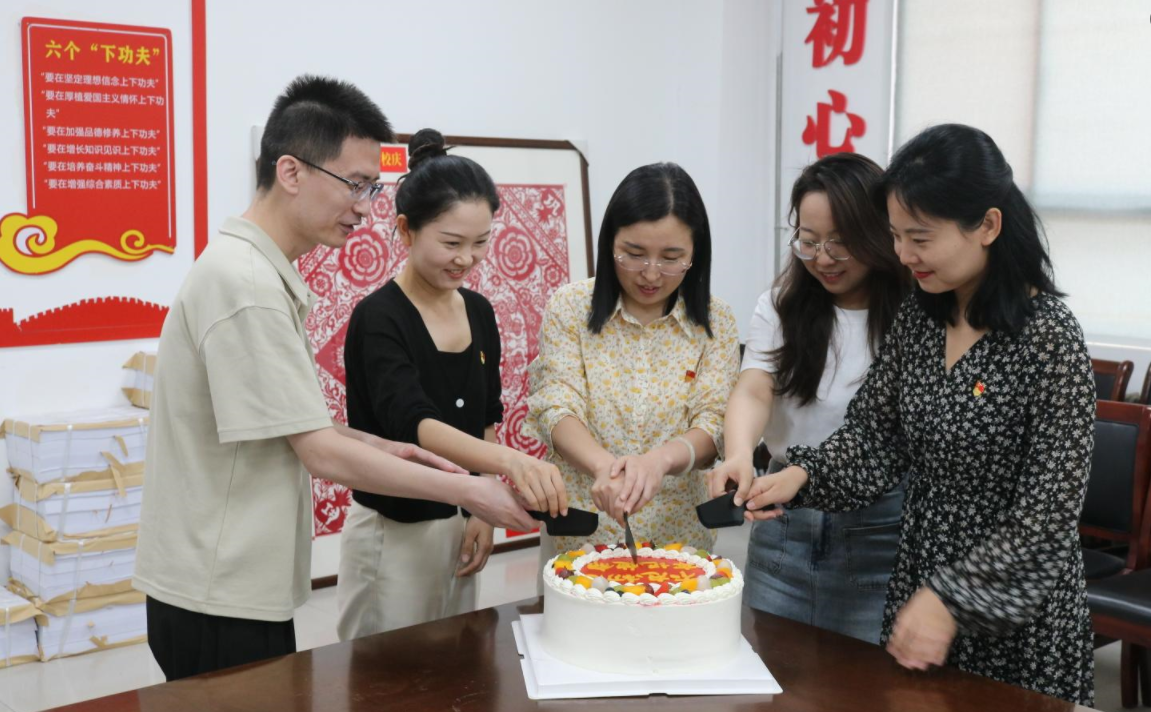 其次,我院过政治生日的党员代表分享入党感受与心路历程。李亚林老师谈到,作为一名党员和思政课教师,对于教育事业的“爱”必须是忠诚的,发自内心的,要坚定理想信念,筑牢“信仰之基”,给予学生正确的价值引领;姚瑞老师结合入党经历分享自己的入党故事,表示不论作为党员还是教师,要始终坚持以习近平新时代中国特色社会主义思想为指导,学思想、强党性、重实践、建新功。在分享环节结束后,各党支部书记分别为张党诺、王丁、姚瑞、李亚林、魏亚旭等几位同志赠送政治生日贺卡、切政治生日蛋糕,共庆政治生日。