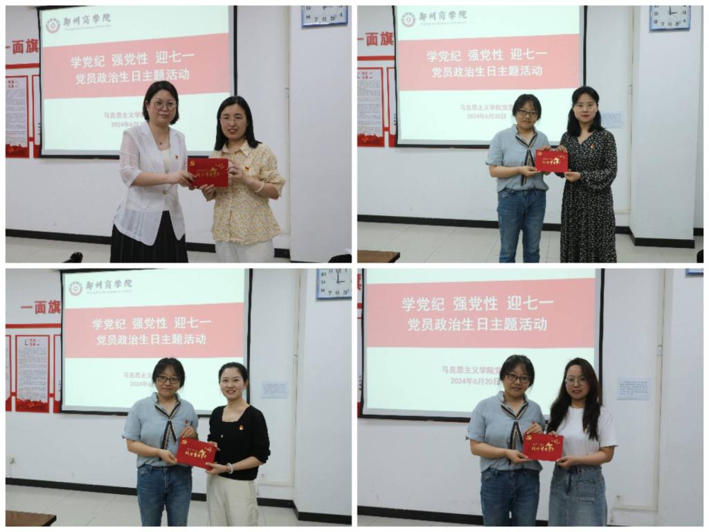 为庆祝中国共产党成立103周年,激励党员不忘初心,牢记使命,6月20日下午,我院党委在党员活动室组织开展党员政治生日主题活动。本次活动由我院党委书记张艳丽主持,院长张党诺和各支部教师党员共同参加了此次活动。