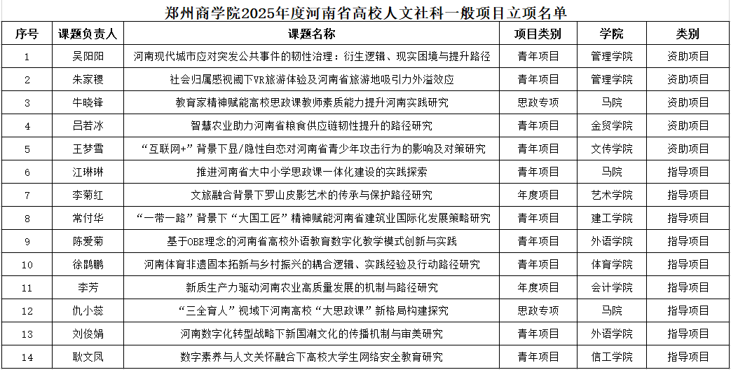 根据《河南省教育厅办公室关于2025年度河南省高校人文社会科学研究一般项目申报工作的通知》(教办社语〔2024〕94号)要求,beat36514项2025年度河南省高校人文社会科学研究一般项目获批立项,其中资助性项目5项,指导性项目9项。