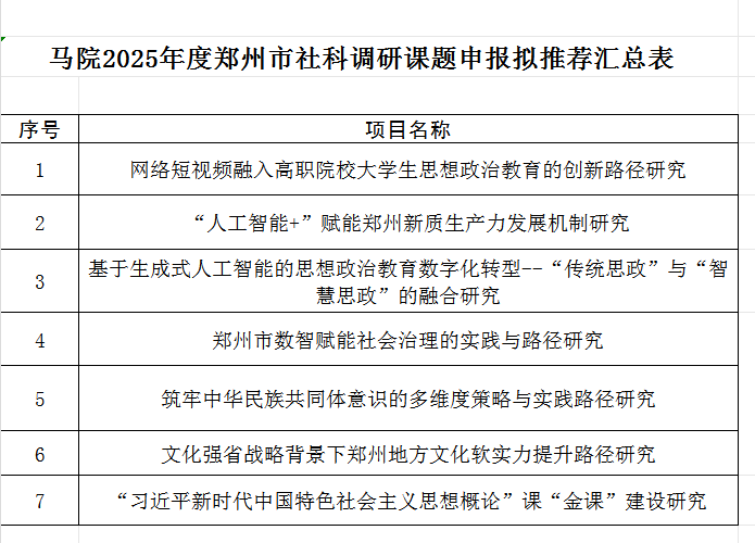 根据beat365《关于组织申报郑州市社科联2025年度调研课题的通知》要求,我院限报7项。经前期精心组织,广泛动员,马克思主义学院共收到11项申报书。经我院学术委员会评审后,拟推荐以下7项申报书作为我院2025年度郑州市社科联调研课题最终提交材料,名单如下: