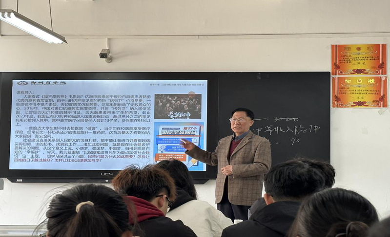 课上,李义军教授围绕《习近平新时代中国特色社会主义思想概论》第十一章第一节“让人民生活幸福是‘国之大者’”进行示范教学,以《我不是药神》背后的故事为导入,巧妙地将学生感兴趣的医疗话题与理论知识结合,让学生深刻体悟到“民生是人民幸福之基”的重要含义,同时让学生认识到“小康梦”“强国梦”“中国梦”,归根到底是老百姓的“幸福梦”。