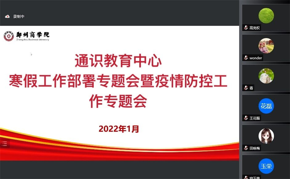 为了更好的做好疫情防控工作,筹划和部署下学期的重点工作,1月5日上午,通识教育中心通过腾讯会议召开了寒假工作安排专题会暨疫情防控工作大会。通识中心主任闫蕾蕾、党委书记王花磊及中心全体教师参加。