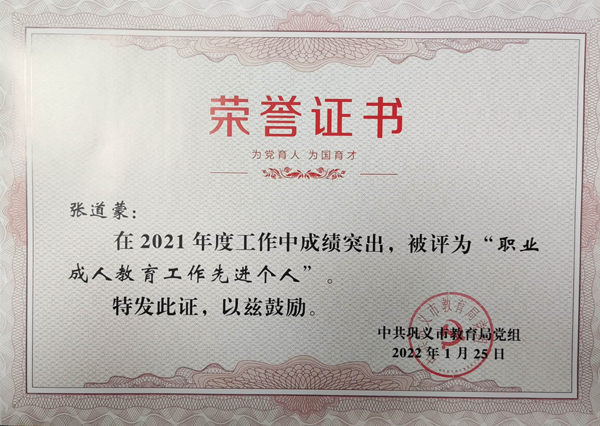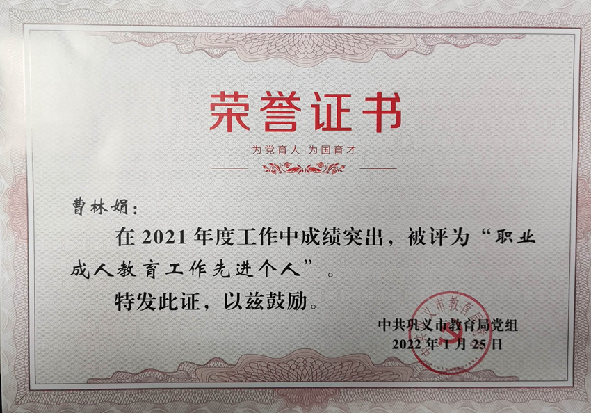 日前,从巩义市发布的文件获悉,我中心张道蒙、曹林娟两位老师在“巩义市教育系统2021年度先进集体和先进个人”评选活动中成功入选“职业成人教育工作先进个人”。