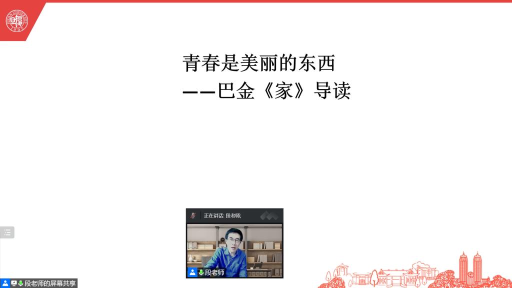 段教授为期三天的授课,分别为我们介绍了鲁迅、巴金和曹禺三位现当代文学大家的作品,通过发⼈深省的追问,富有哲理的讲述和对《红楼》《呐喊》等经典文本的旁征博引,带我们领略了中国现当代文学的精彩篇章,为我们提供了解读经典文学的视角和方法,特别是这些文学作品中青年人的困境与选择,对于今天的广大同学仍然具有现实的启发意义。