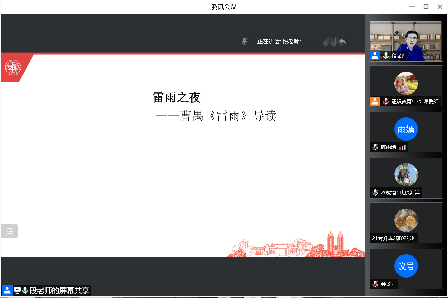 最后,结合曹禺的《雷雨》,段教授首先为同学们介绍了《雷雨》的体裁,故事改编与呈现形式等,以及作者对“不同的人对《雷雨》有不同解读”的默许态度。《雷雨》以1925年前后的中国社会为背景,描写了一个带有浓厚封建色彩的资产阶级家庭的悲剧,同时具备文学性、社会性与伦理性,是一部优秀的文学作品。段怀清教授从阅读线索、人物形象和文本分析三个方面带领广大师生进行了解读,通过对故事中的场景意象、人物塑造和台词语言等方面的分析,为大家阐明了《雷雨》之所以成为经典的原因。段教授还讲到在文学阅读中的“代入感”问题,让大家知道文学作品是从个体到一般抽象的转换,是对现实生活的高度凝练和浓缩,它来源于现实生活,又不等同于现实生活。
