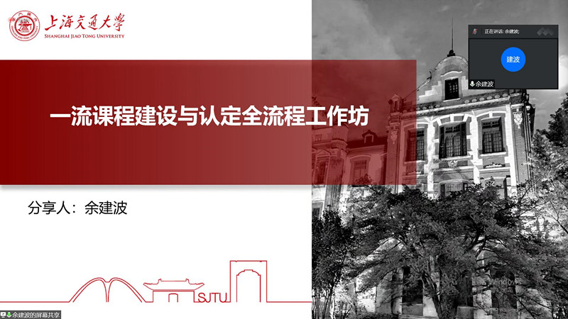 培训共分为五个主题,前四个主题《对标一流课程评审标准准备第三批一流课程申报》《对标一流课程标准一流课程申报材料的填写要领》《对标一流课程评审一流课程申报附件》《一流课程的建设成果提炼与总结汇报》,由上海交通大学教务处在线课程负责人余建波老师进行讲授,余老师首先从第一、二批一流课程的认定结果,结合申报政策进行数据分析,开展课程培育;其次通过分享线上、线下以及线上线下混合式一流课程评审标准与案例来讲解申报材料的填写要点;通过优秀案例详细描述一流课程的教学方法改革、教学设计、教学实施方案、教学日历等方面应当如何设计;最后针对一流课程的建设成果进行提炼与总结。最后一个主题由国家级一流课程(社会实践类)负责人王瑶老师主讲《社会实践一流课程建设与认定经验分享》,王老师主要从课程申报与课程建设两个方面详细地讲解了社会实践类课程的申报要点与其积累的经验。