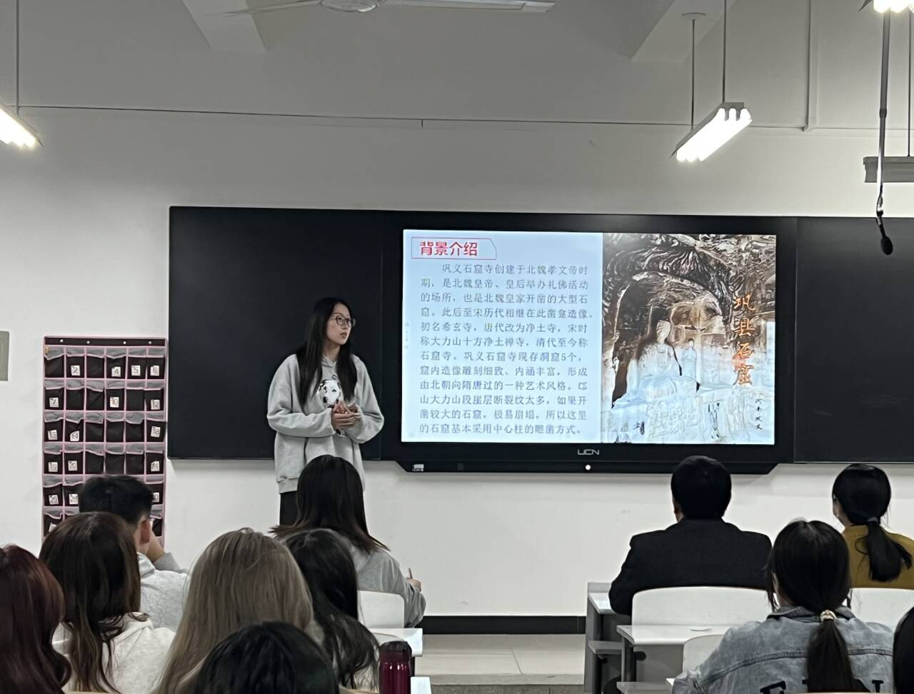 在活动中,各组上台展示的同学分别汇报了他们在康百万庄园、杜甫故里、宋陵公园、巩义石窟寺、巩义博物馆等处的考察情况,并结合课程学习,对豫商文化内涵、杜甫的家国情怀、中原古典建筑特色、古代雕刻艺术的成就、巩义陶瓷文化巨大影响等课题深入研讨,由衷赞叹中原劳动人民的聪明才智和精湛技艺,深刻感悟到中原文化的厚重底蕴和现实价值,加深了对中原文化丰富内涵的理解,增强了文化自信,坚定了爱国主义理想信念,表示了为传承弘扬中原传统文化贡献力量的决心与信心。展示过程中,邢克鑫、赵振义、罗丹三位老师分别对各组展示内容作了现场点评,提出了指导意见。