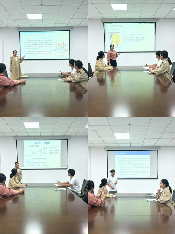 活动伊始,每位新教师进行微课展示。张璐阳老师试讲内容为《大学生沟通技巧与艺术》中的第一章沟通简论,主要涵盖了沟通的定义、特点和类型等内容。在试讲活动中,张老师通过游戏、课堂讨论等形式,让学生主动参与到课堂中来。同时通过分析近些年大学生就业现状,使学生了解到大学生在日常学习、生活和工作中掌握沟通技巧的重要意义。雷玉婷老师讲述的主要内容是《现代礼仪》课程中的第一章礼仪引论,涵盖礼仪的实质、原则、作用等内容,在试讲过程中,通过案例分析、现场展示等教学方式引导学生主动参与,整体课堂互动良好、氛围较活跃,能够引导学生进行主动思考,使得同学们真正了解到礼仪的意义以及日常工作生活的重要性。刘桂娟老师讲解了《微积分》课程第二节实数回顾和梳理实数知识点。包括实数的分类、有理数的表达形式、无理数的概念等内容,并指出实数和数轴上的点是一一对应的。王元魁老师从《微积分》课程的发展史开始介绍,讲解了函数关系,强调在确定函数时要注意两大要素:定义域和对应法则。