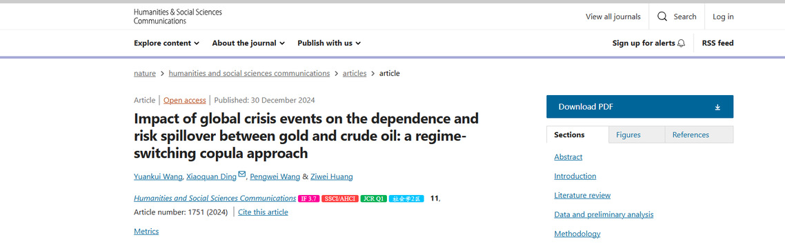 近日,我中心青年教师王元魁以第一作者在Humanities and Social Science Communications发表题为“Impact of global crisis events on the dependence and risk spillover between gold and crude oil: a regime-switching copula approach”的论文,讨论了全球危机事件对黄金和原油之间依赖结构以及风险溢出的影响。