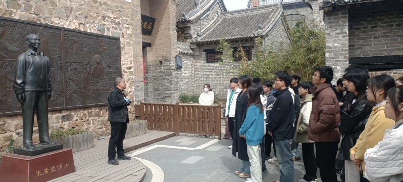 本次教学实践以“建筑探微+文化溯源+精神寻根”三大主线贯穿全程。在村党支部书记的引导下,师生系统考察了豫西古民居榫卯结构建筑群,研读村民戒赌石碣中蕴含的治家智慧;在乡村艺术大学观摩非遗技艺的现代转化实践;重点走访豫籍教育家王广亚故居,通过珍贵的图文影像资料,深入研习其“潜心办教育,倾心报桑梓”的办学初心,解读“伦理、创新、品质、绩效”的办学理念,传承“爱国爱校、宁静好学、礼让整洁”的育人精神。