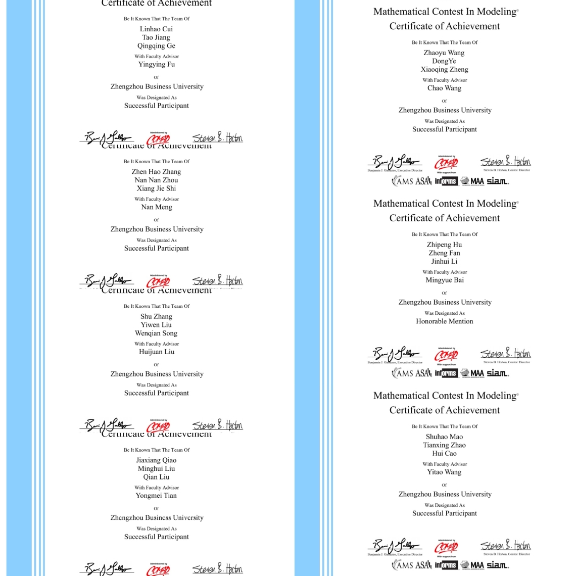 本次比赛学校领导高度重视,通识教育中心精心组织,相关二级学院通力合作,多次邀请有关专家进行指导培训,数学建模团队教师悉心指导,参赛学生积极备战,通过选题、资料查找、分析计算、英文写作等环节圆满完成参赛任务,高质量提交竞赛论文,最终取得优异成绩。