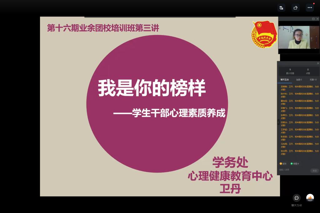 3月31日18:00,beat365第十六期业余团校培训班第三讲以线上钉钉直播的方式顺利举行,心理健康教育中心卫丹老师以《我是你的榜样:学生干部心理素质养成》为主题作了报告。2021级各班班长、团支书共六百余名同学参与此次讲座。