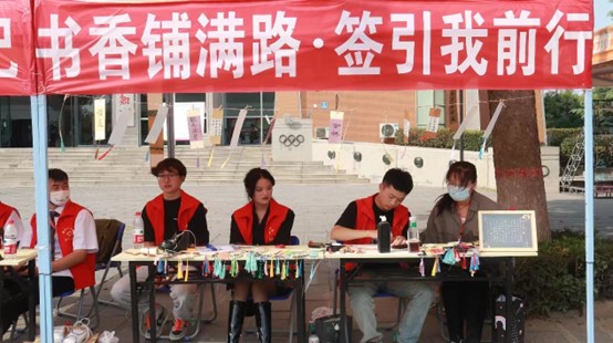 在迎新工作的当天,校团委工作人员在体育馆前设置了团团迎新站、失物招领处和广播站服务台。团团迎新工作站还开展了丰富多彩的迎新活动,如团团迎新文艺演出、时光邮筒——写给四年后的自己、“书香铺满路·签引我前行”书签赠送等活动接连收获高人气。