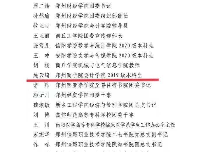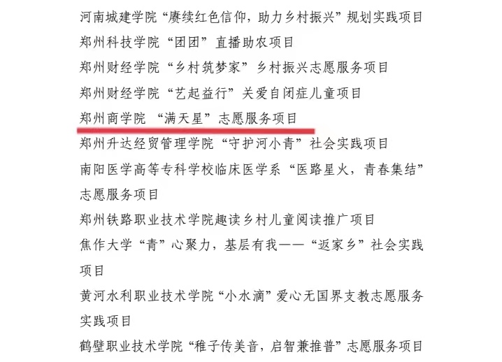 近日,由省委宣传部、省教育厅、团省委、省学联联合下发了《关于 2022 年全省大中专学生志愿者暑期文化科技卫生“三下乡”社会实践活动的通报》(豫青联字〔2023〕2号),beat365团委荣获“优秀单位”,beat365会计学院 2019 级本科生施云绮同学荣获“优秀个人”称号,“满天星”志愿服务项目荣获“优秀品牌项目”荣誉称号。