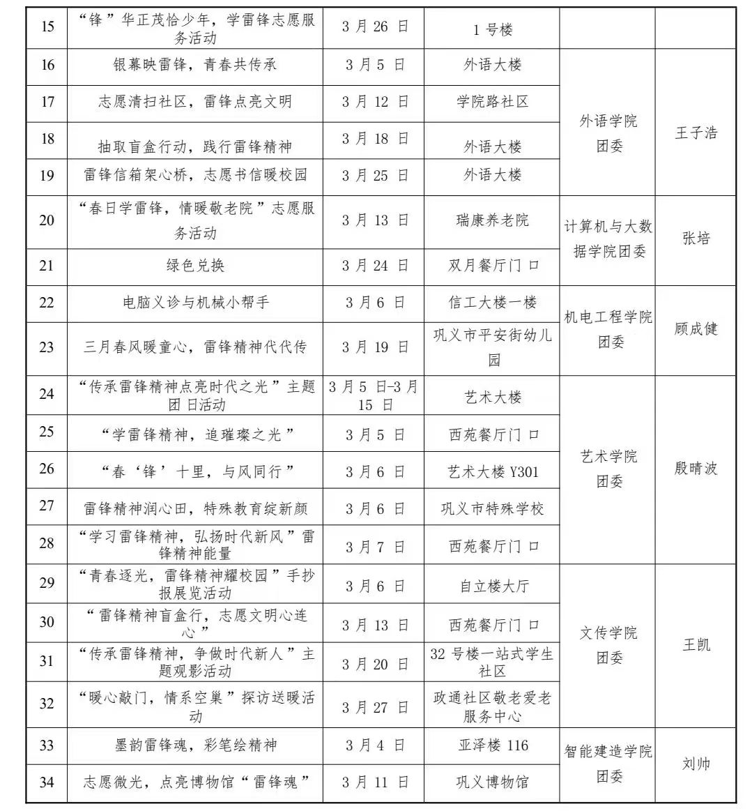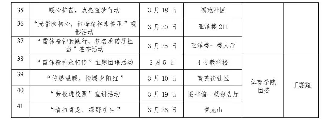 各级团组织、青年志愿者协会要以3月5日“中国青年志愿者服务日”为契机,依托“志愿汇”APP积极推进在校生成为注册志愿者,力争实现学校全体共青团员青年志愿者注册全覆盖, 人均年度志愿服务时间不少于20小时。进一步加强青年志愿者的培训培养和激励嘉许工作,让广大青年志愿者更有获得感;以新媒体为主要方式和途径,策划特色鲜明、类型多样的青年志愿服务主题宣传活动,制作推出人民群众喜闻乐见的青年志愿服务文化产品,选树好、宣传好青年志愿服务优秀典型,宣传报道广大青年志愿者的生动实践,讲好新时代雷锋故事。
