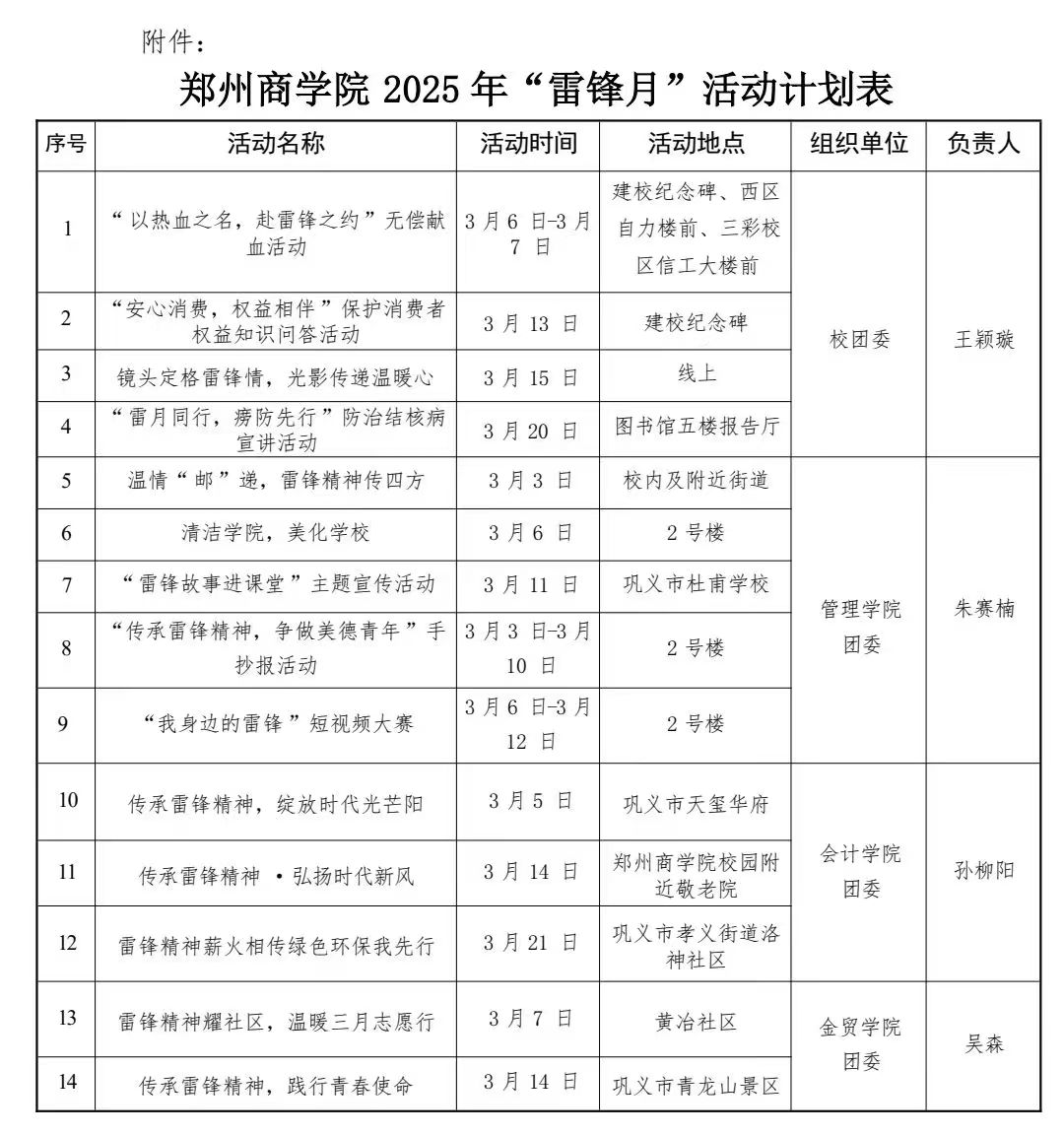 1.提高政治站位,加强组织领导。全校各级团组织、志愿服 务组织要充分认识开展学雷锋主题活动的重要性,把这项活动作为培育团员青年践行社会主义核心价值观的有效措施,作为深化全校志愿服务行动的具体载体。各学院要高度重视、科学部署、精心组织,根据工作方案,结合自身实际抓好落实,确保活动成效。