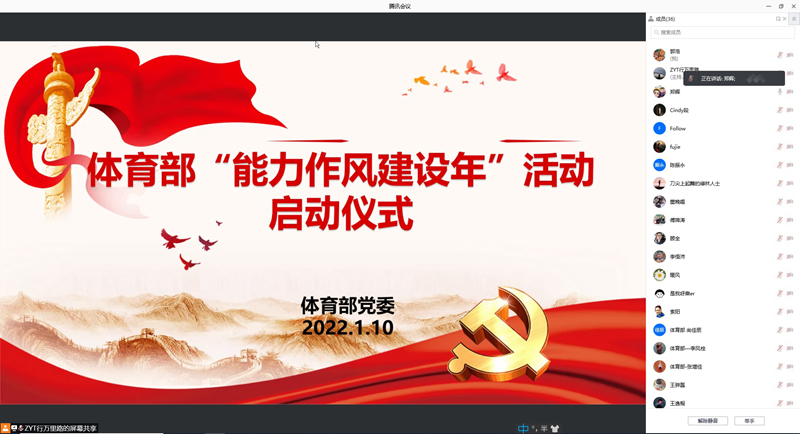 为深入学习贯彻党的十九届六中全会精神,贯彻落实习近平总书记视察河南重要讲话重要指示,推进学校治理体系和治理能力现代化,按照beat365“能力作风建设年”活动动员部署会的要求,我部于110日上午9时,组织全体教职工举行线上会议,开展体育部“能力作风建设年”活动启动仪式。