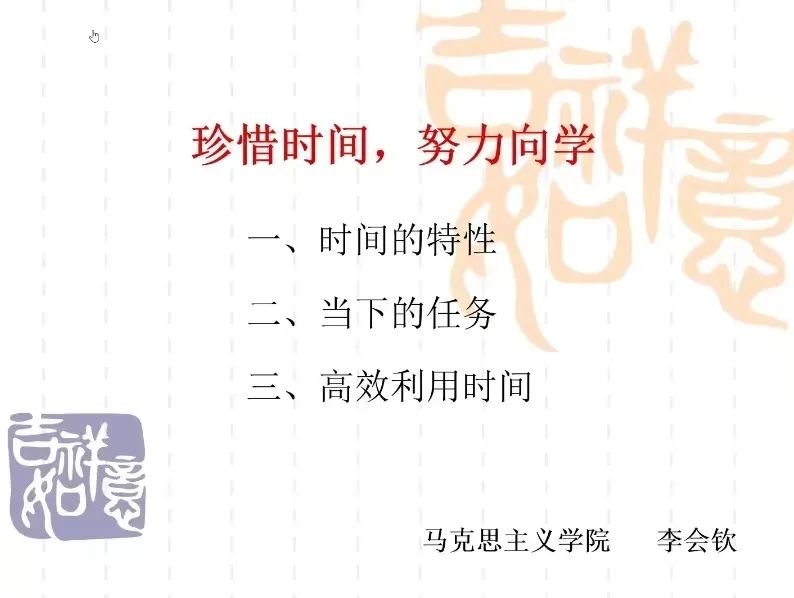 李会钦教授从“时间的特性”“当下的任务”“充分发挥时间效能”三个部分开展授课。他为同学们讲述了当代青年所处的时代背景和肩负的历史使命,提醒同学们当下要模塑品格、积累知识、锻炼能力、克服不足,充分发挥时间效能,厚植家国情怀,强化使命担当。最后向同学们寄予希望,愿同学们钻研高深学问,练就过硬本领,矢志强校追求,共谱绚丽篇章。
